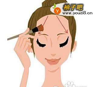 最后一步要选择一支散粉刷,沾取少量散粉,在额头位置呈八字形刷一下,这样做可以弱化菱角,给人以甜美的印象。
