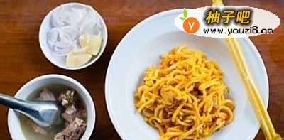 缅甸人喜欢"干"面小吃--从本质上来说其实是用面做的沙拉,配上肉汤--而其中最美味最普遍的一种就是nangyi thoke。