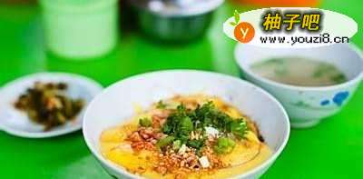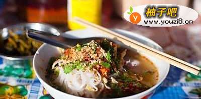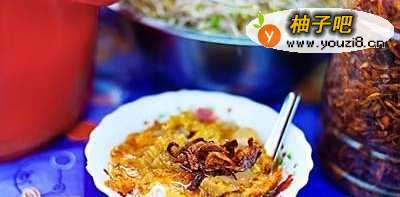 这种小吃用鸡肉、切成片的鱼饼、豆芽和卤鸡蛋配上米线,非常好吃。