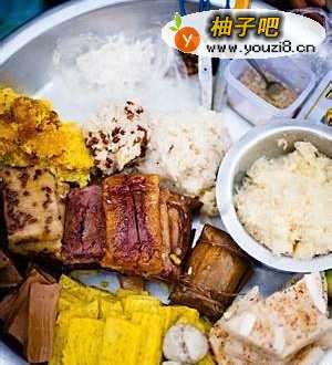 这种黏黏的黄色的粥通常伴米粉和腌制的鸡肉或猪肉。粥上会淋一点辣椒油,配有腌菜和肉汤。
