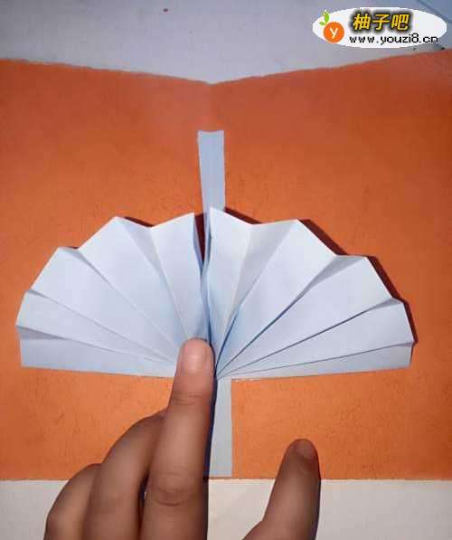 4把步骤3完成的折纸,在中间的位置折叠,并利用双面胶在中间把他们,粘合成扇子的形状。