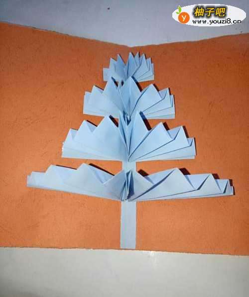 首先把材料备好。此处使用的蓝色卡纸是折叠圣诞树的,最好使用绿色的。把做贺卡的硬卡纸,裁剪出贺卡的样子。