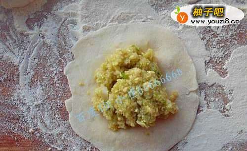 7取一个面剂子擀成薄厚均匀的饼皮,盛适量的馅料放在中间。