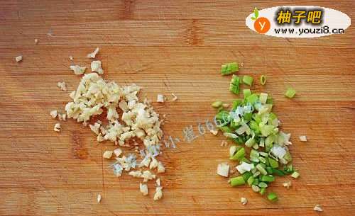 4还要准备适量的蒜末和葱花。依个人口味,葱花可以切的碎一点。
