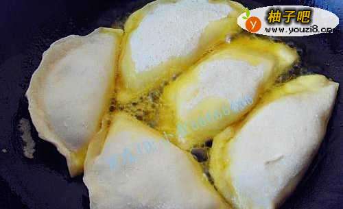 9锅里倒入适量的花生油烧热,将包好的头菜盒子放进锅里煎一下。