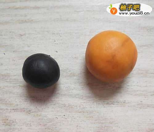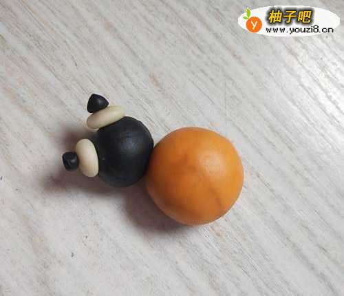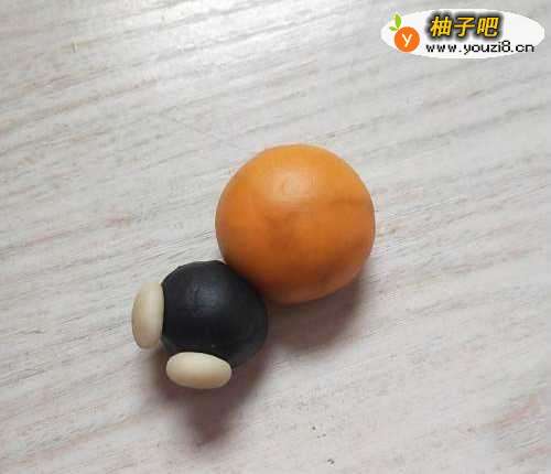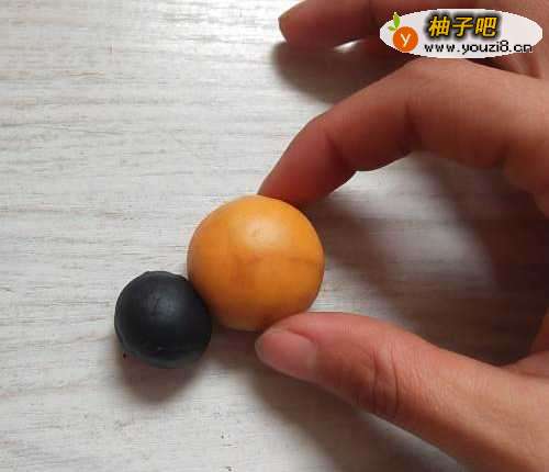 首先取一块黑和一块黄的橡皮泥搓成圆球,黑的要小一些哦。