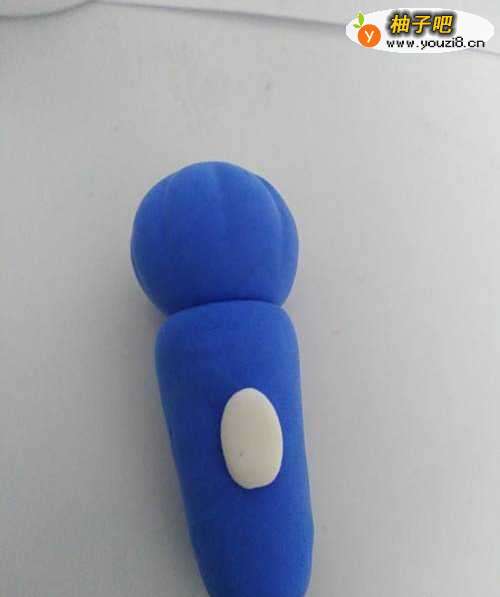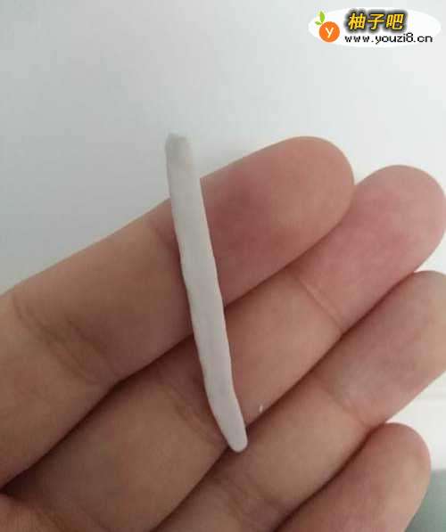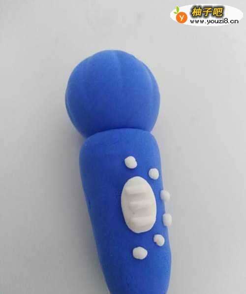 4白色粘土先做一个小的椭圆形圆片,粘在麦克风手握的位置,之后再取一点粘土,搓成细条,剪成小段,粘在表面,做出调节音量按钮
