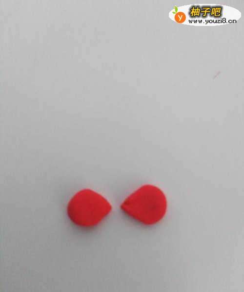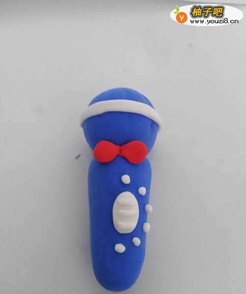 7红色粘土取一点,做一个蝴蝶结,粘在麦克风话筒与手柄中间的部位,起个装饰作用,麦克风就做好了