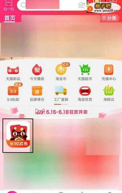 打开淘宝进入首页,可以点击搜索框旁的“合猫猫”或者页面中“分三亿”都可以进入合猫猫.