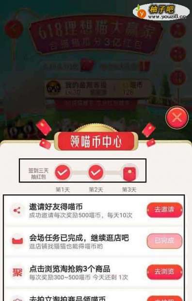 3如果喵币不够可以点击“领喵币中心“,这里可以签到三天领,邀请淘友助力可得500喵币.“等任务都可以获得喵币