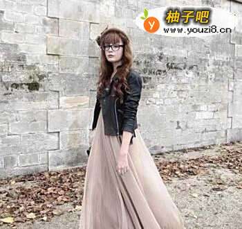 个性酷酷的女生,可以选择皮衣的搭配,个性皮衣搭配纱裙是近年来的热门搭配,女生偶尔也要装酷一下