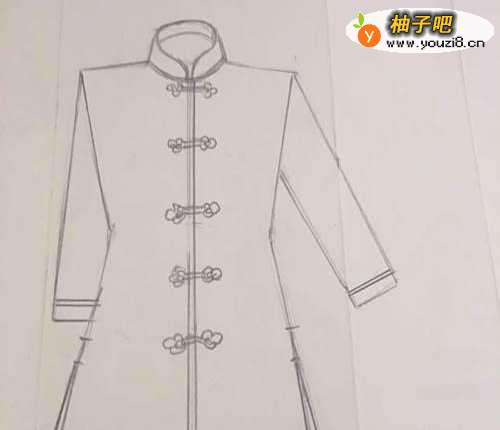 6第六步 画上领子及前门袖口的黑边 然后画上盘扣和开叉 就行了