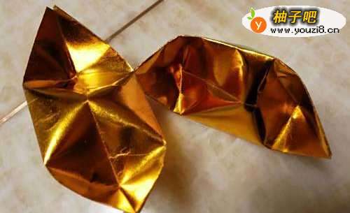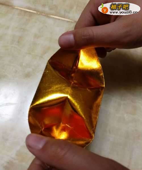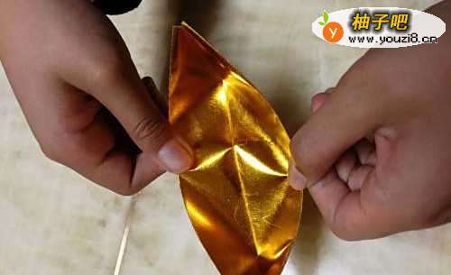 6不断内压,使中心冒出一个金黄的尖,将纸形加以捏收,就现出了饱厚的元宝啦。