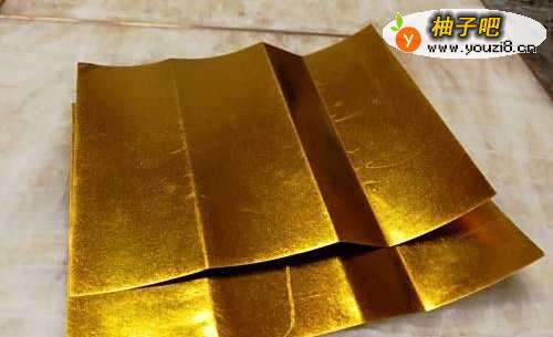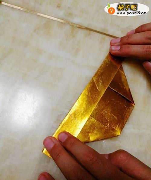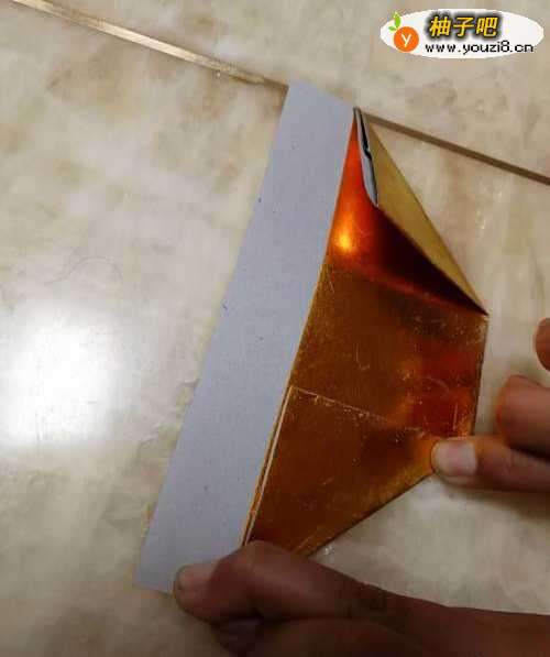3然后将金色这个层面沿底向上折入两个相致的三角,要重重的捏挤。