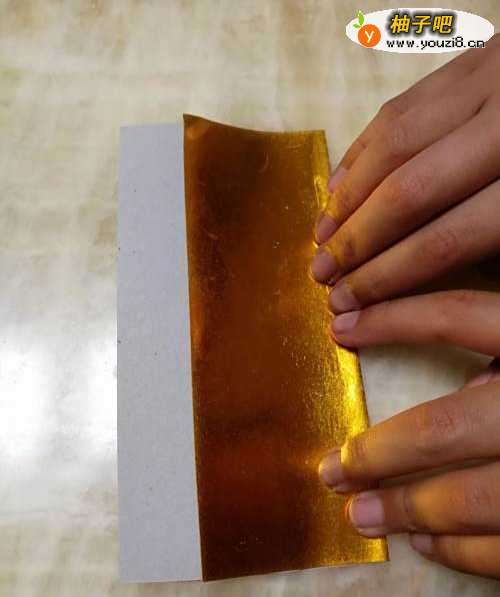 将金面的长方锡纸取出,这是我示纳的折痕,将一边折到3:1的位置处;另一头也是相近折法。