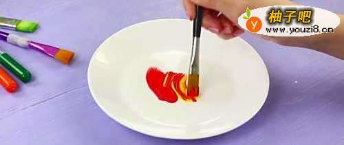 首先在颜料盘中挤出黄色和红色的颜料