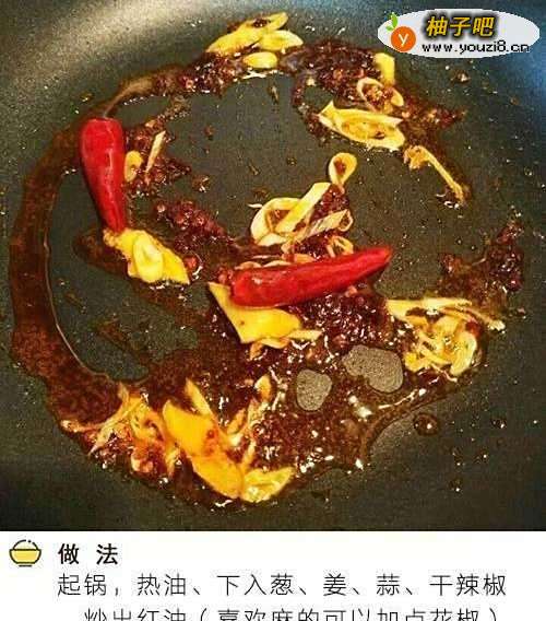 3起锅,热油,下入葱、姜、蒜、干辣椒,炒出红油(喜欢麻的可以加点花椒)~