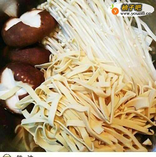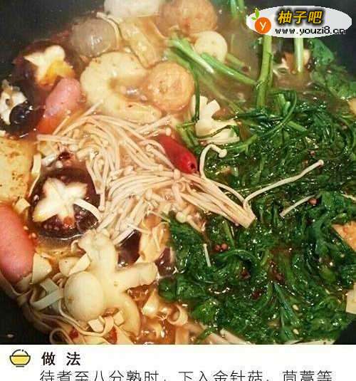 6待煮至八分熟时,下入金针菇、茼蒿等蔬菜,大火煮至全熟~