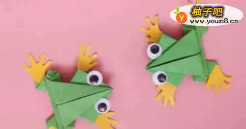 6翻到正面,贴上四只脚和眼睛,可以弹跳的青蛙就做好了。