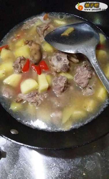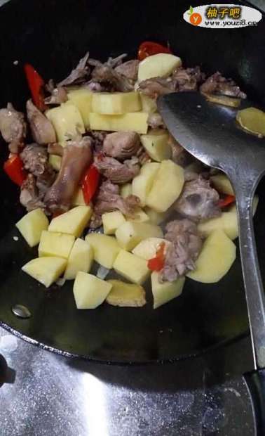 7加水,水没过鸭肉的和土豆。盖上锅,大火炖。炖10分钟,用锅铲翻一下,盖上锅盖,中火继续炖10-20分钟。揭锅盖,用筷子撮一下土豆,土豆熟了就可以出锅了。