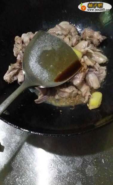 4倒入鸭肉,翻炒,加少许酱油,继续翻炒3-4分钟