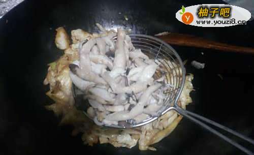 7加入蘑菇,加食盐、酱油翻炒均匀。