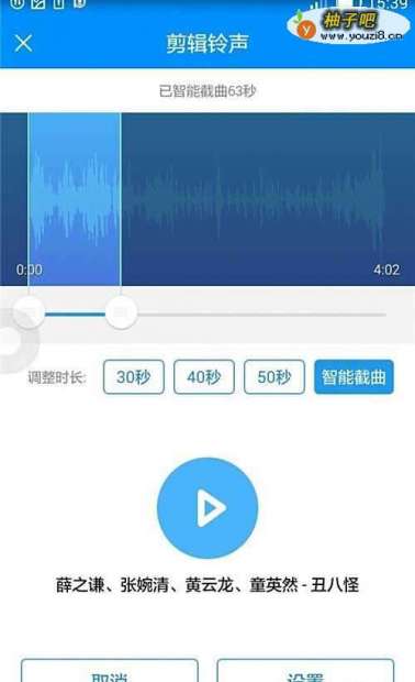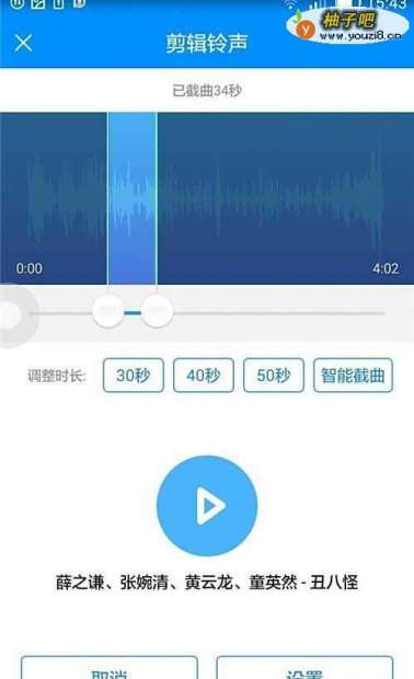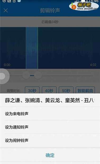 6录制结束后,进入剪辑铃声页面,点击“设置”-“确定”保存音频,也可以把裁剪好的音频“设为来电铃声”、“设为通知铃声”、“设为闹钟铃声”