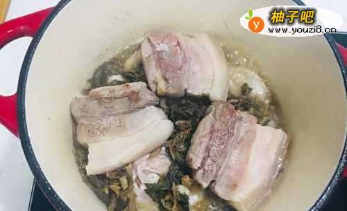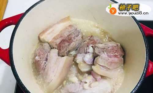 2把五花肉煎出油,放入蒜爆香,加少许水小火煮