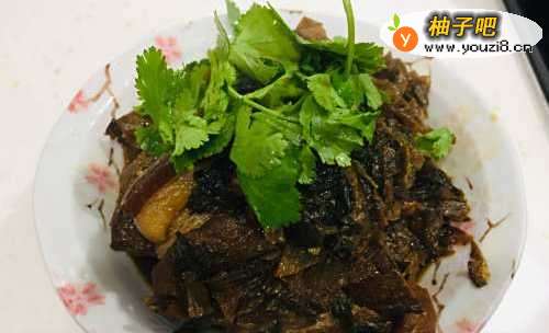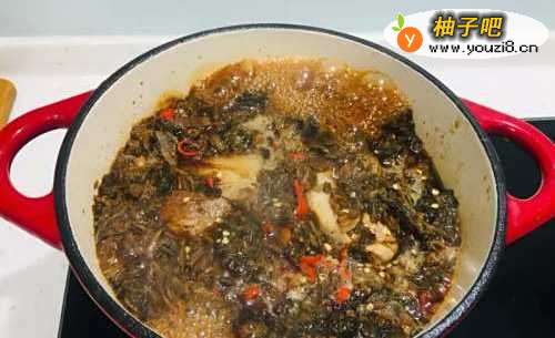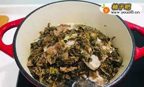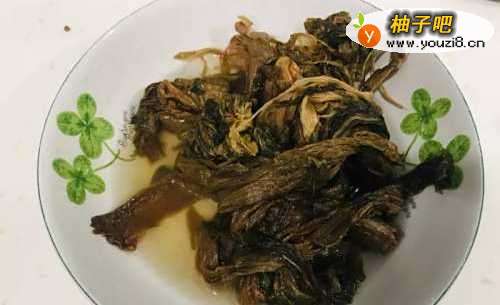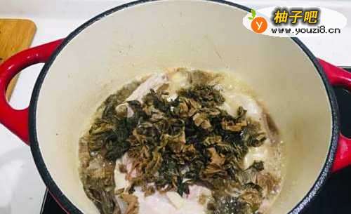 5最上一层铺满梅干菜,放入酱油、蚝油、辣椒、水炖煮