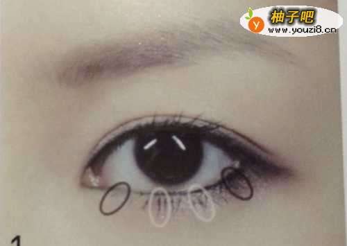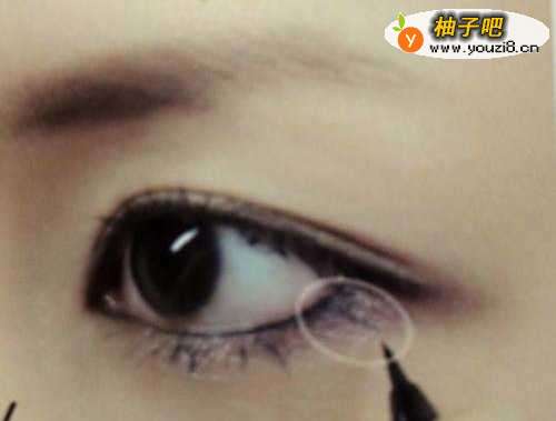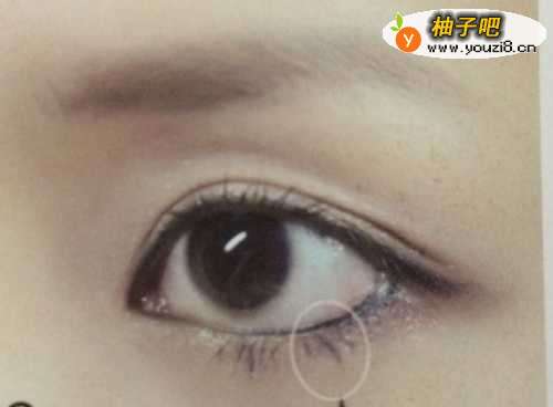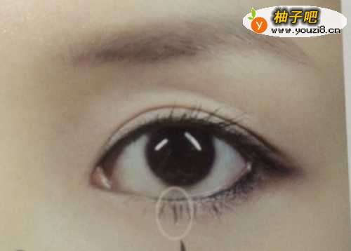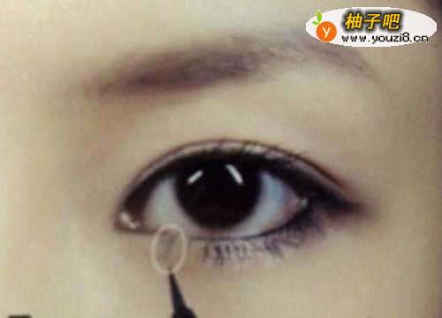 2然后我们选择从下睫毛的中间部分开始使用眼线笔填充(眼球的下方)。在凝结一起的睫毛的正下方填充,从睫毛根部开始结尾处画得要细,不能超过现实睫毛的长度,才有自然真实感,要画的很细很细哦。