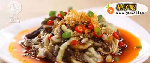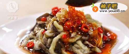 7锅中油热至八成时浇在茄子上,趁热拌匀。