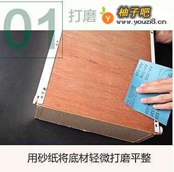 用砂纸将底材轻轻打磨平整,去掉表面灰尘,如果之前刷过漆的,只需用砂纸轻砂下,表面掉一层粉即可,不用把漆全部打磨掉,增加表面附着力;