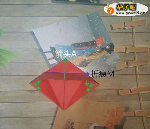 5再将上层纸朝箭头A方向以折痕M为准向上翻折,同时结合左右的短箭头方向将左右压合成图2形状,下层纸也是按相同的方法折叠如图3。