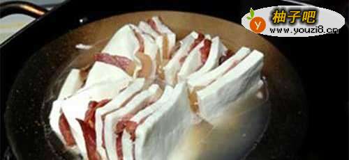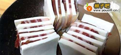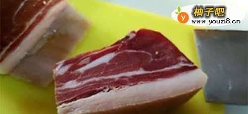 2想好要切多大的方块,然后切同等大的火腿块下来,去皮,肥瘦都有最好