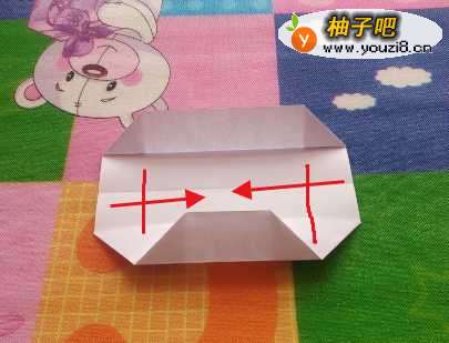 12中间红线向里压平,同时左右两角向处折,使左右两边也向里折。