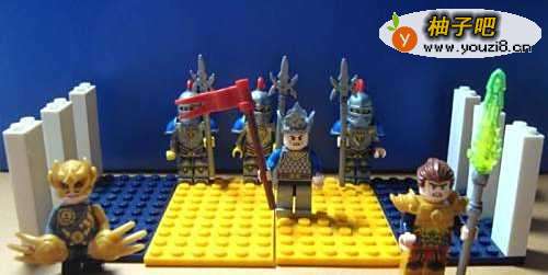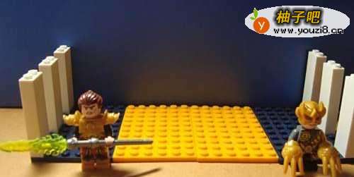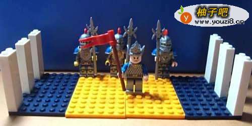 3接着,取出两小将军的积木,头戴头盔,身穿盔甲,摆放的位置,如沟材爷下图所示。