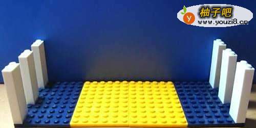 2这里先找出一个橘色的底板积木和两块蓝色底板积木连在一起,并把立柱积木拼装在蓝色底板积木上,作为比武训练的场地,摆放的位置,如下图所示。
