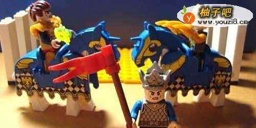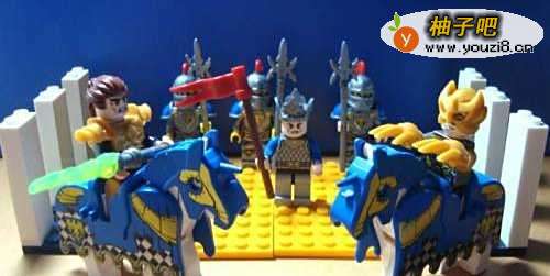 6最后,给场景中的小将军积木搭配上两个重骑兵营里的马,放在比武场地的前面,表示在训练中。这样比武场擂台比赛的场景往译就搭建好了,如下图所示。