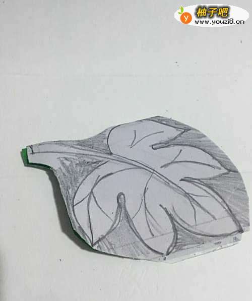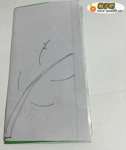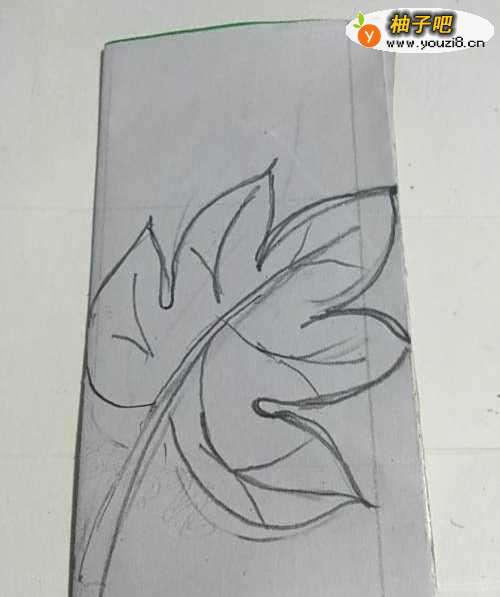2第二步 折叠完之后 再次向上折叠一次 然后竖起来双边在左 拿起绘图铅笔 画上树叶的纹缕部分
