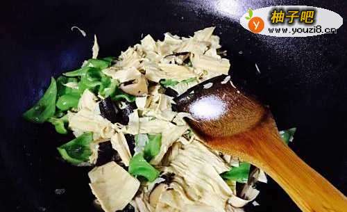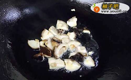 3接着开火,锅烧热之后加入适量油,油温至8成热的时候先把香菇倒进去翻炒,翻炒至香菇香味出来后加入腐竹,大火翻炒过程中加入1勺酱油,翻炒过程大约2分钟。