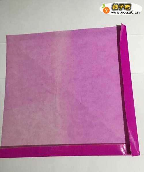 第一步 把一张16厘米X16厘米的正方形二红色彩纸 下边折叠一道0.5厘米的双边 右边折叠一道0.5的双边