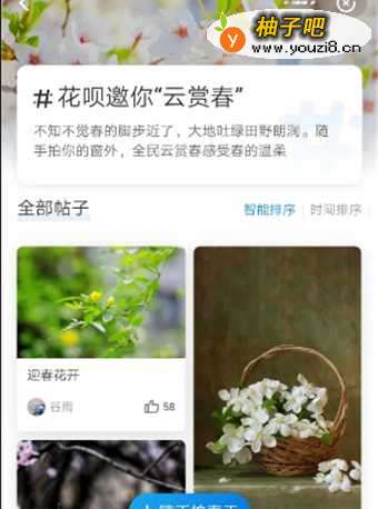 3进入以后可以看到话题和导语,包含全部帖子,点击随手拍春天。