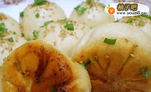 生煎馒头可以说是土生土长的上海点心,据说已有上百年的历史。生煎用 的是半发酵的面粉包上鲜肉和肉皮冻,一排排地放在平底锅里油煎,在煎制过程中还要淋几次凉水,最后撒上葱花和芝麻就大功告成了。