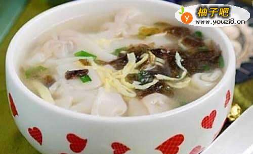 好像上海人对馄饨的大小分的特别清楚。上海的三鲜馄饨也有别 于无锡的三鲜馄饨。馄饨馅并不是鲜肉、开洋、榨菜制成的馅心,而是纯肉的。所谓三鲜名堂皆在汤里,蛋丝、虾皮、紫菜此三鲜调出薄皮包裹着的鲜肉,口感咸香爽滑。