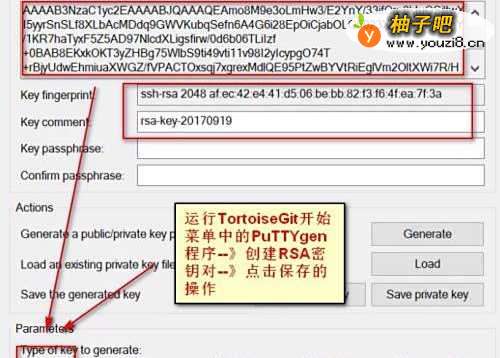 1.实现运行TortoiseGit开始菜单中的PuTTYgen程序--》创建RSA密钥对--》点击保存的操作