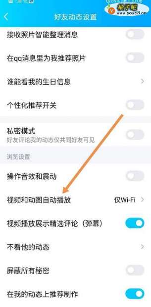 5点击打开好友动态权限设置,找到视频和动图自动播放。