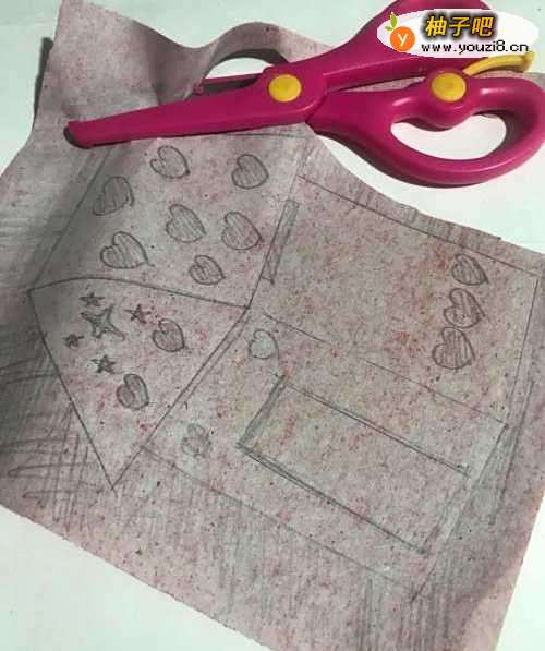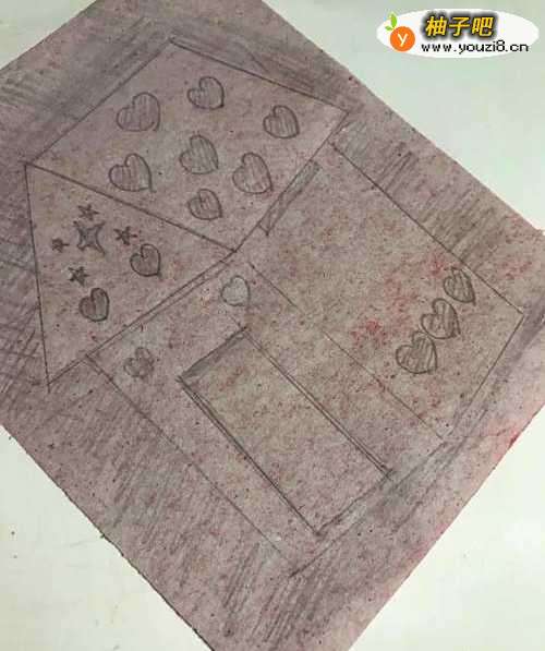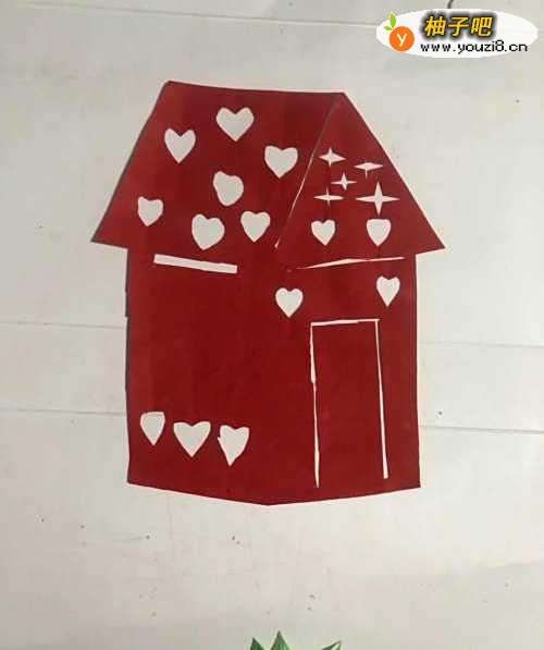 6第六步 剪完外围多余的彩纸之后 再剪里面的小图案 爱心部分和星星 还有门 镂空线等等 全部剪完之后 整理一下 翻过来 一座漂亮的爱心小屋就裁剪完成了