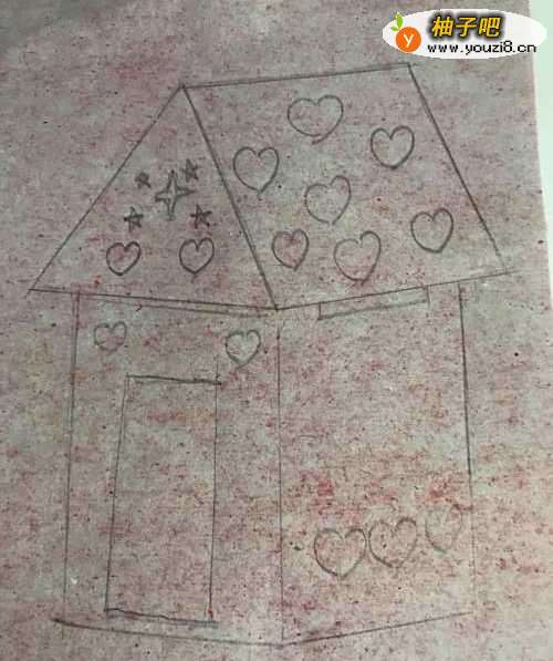 3第三步 画完屋顶之后 再继续画上它的屋檐 下半部分 门 还有小屋上面的爱心 星星等等小图案