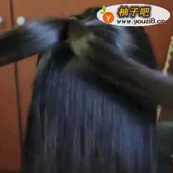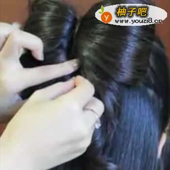 22将已扎起的头发分成两股,一股头发用夹子固定,用卷发棒将另一股做卷。用卷梳将已做卷的头发根部打毛,制造出蓬松感