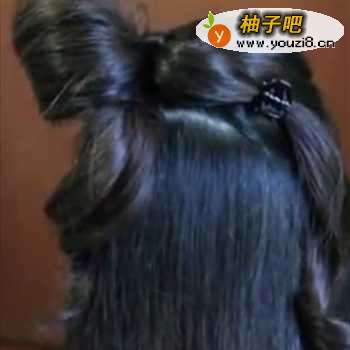 33将这股头发向后弯折出蝴蝶结一边的样子,用卡子固定。另一边的做法同样如此。